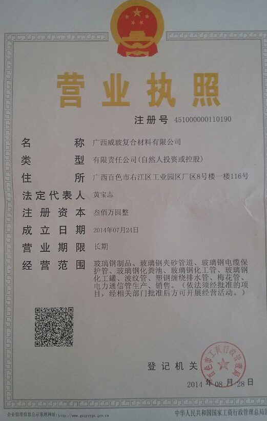廣西威玻復(fù)合材料有限公司擁有先進(jìn)的微機(jī)控制纖維纏繞技術(shù),產(chǎn)品具有強(qiáng)度高、重量輕、耐腐蝕、抗老化、外形美觀(guān)等顯著特點(diǎn)?,F(xiàn)今我們的產(chǎn)品已遍及全國(guó)多個(gè)省市,深得廣大客戶(hù)的信賴(lài)。